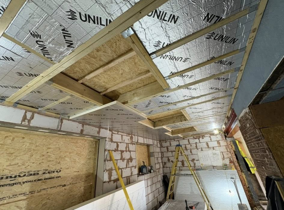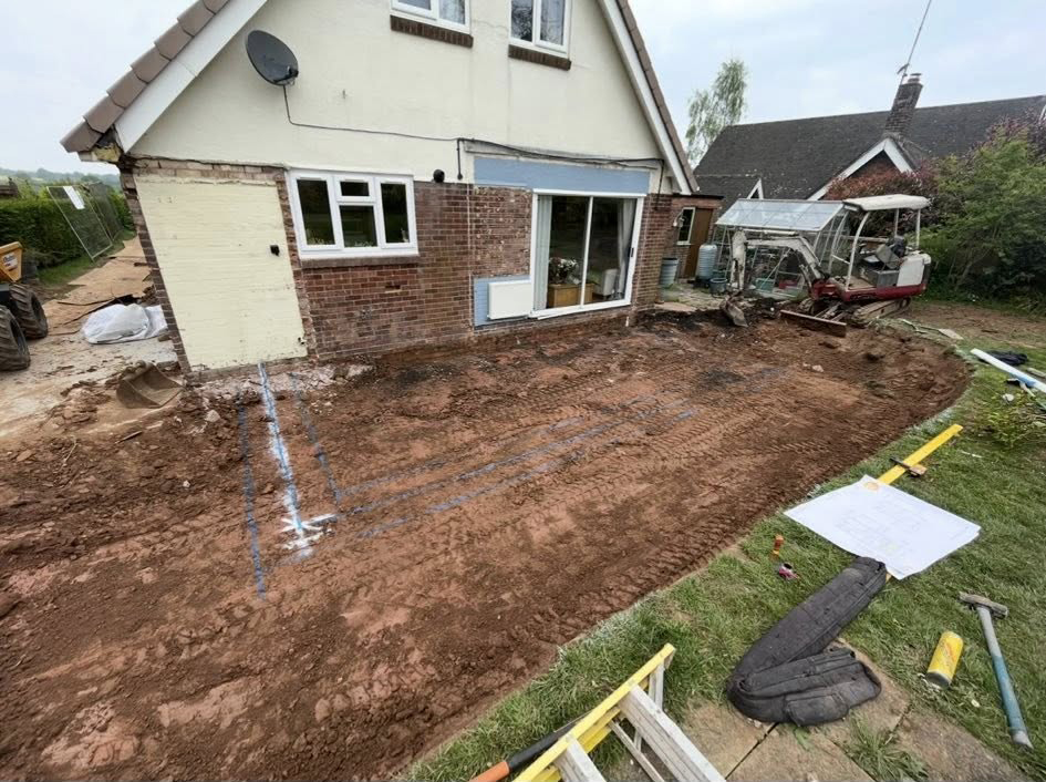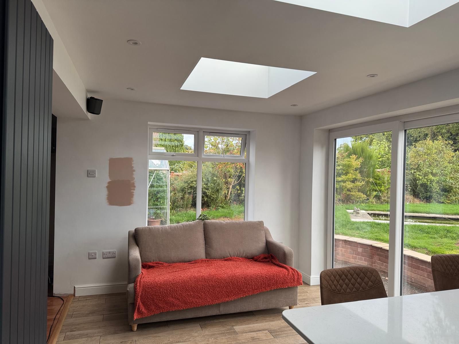 Here’s a recently completed extension in Wormelow, finished just six weeks ago. The open-plan kitchen and living space has completely transformed the home, creating a brighter, more spacious layout with a seamless flow. The addition of three skylights in the flat roof floods the room with natural light, making it a truly inviting space.